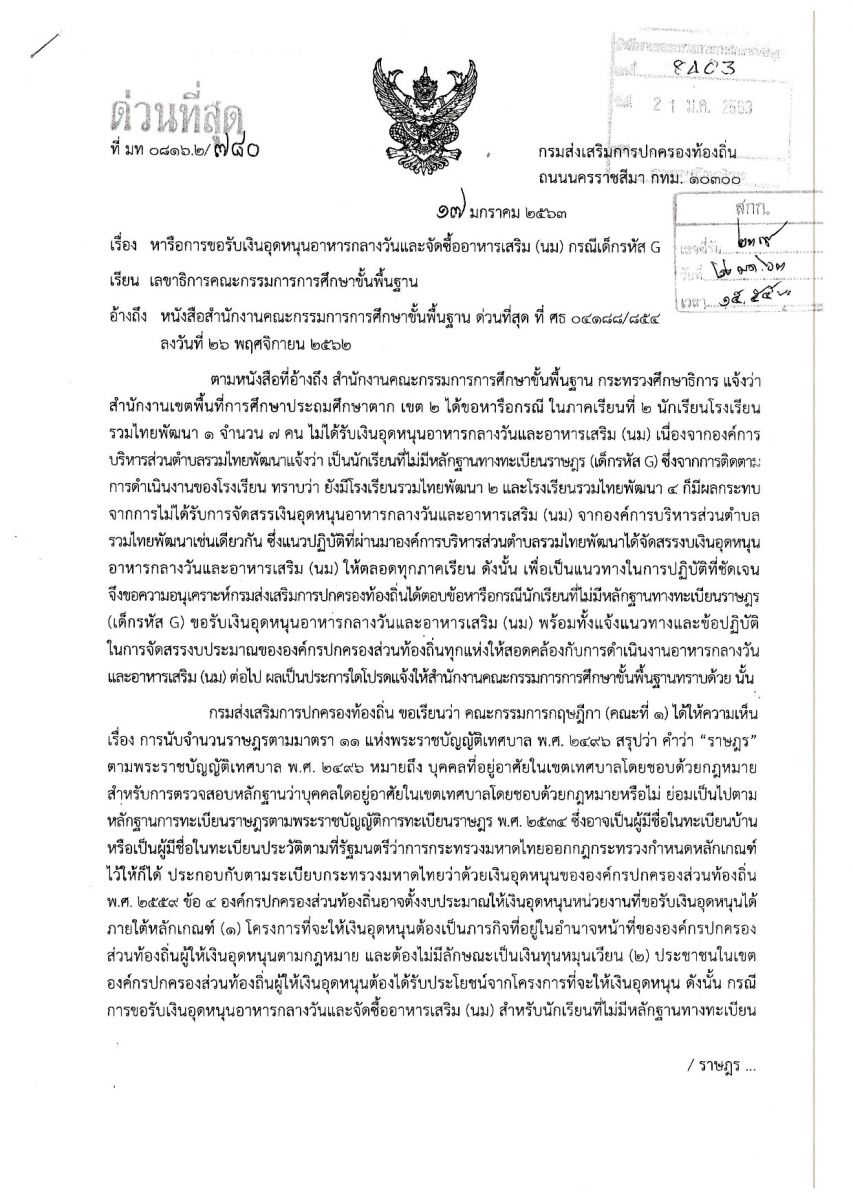 การขอรับเงินอุดหนุนอาหารกลางวันและอาหารเสริม(นม) สำหรับเด็กติด G